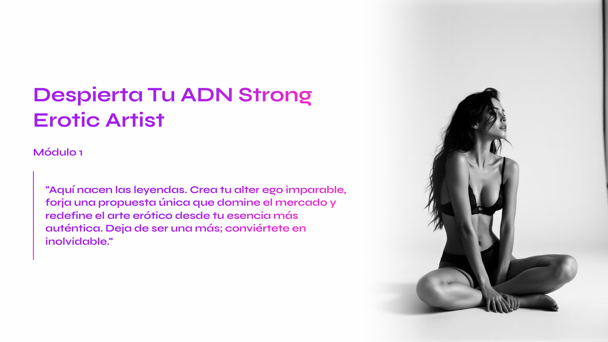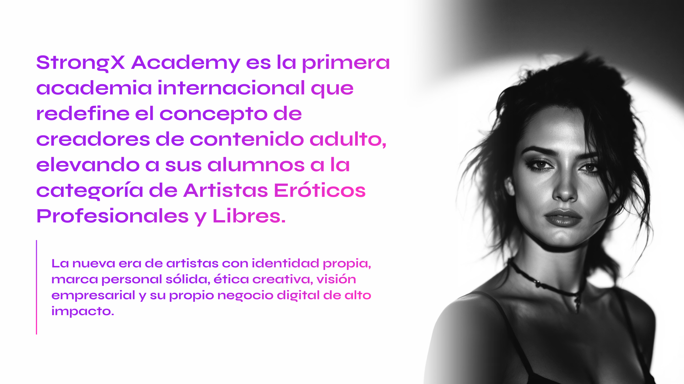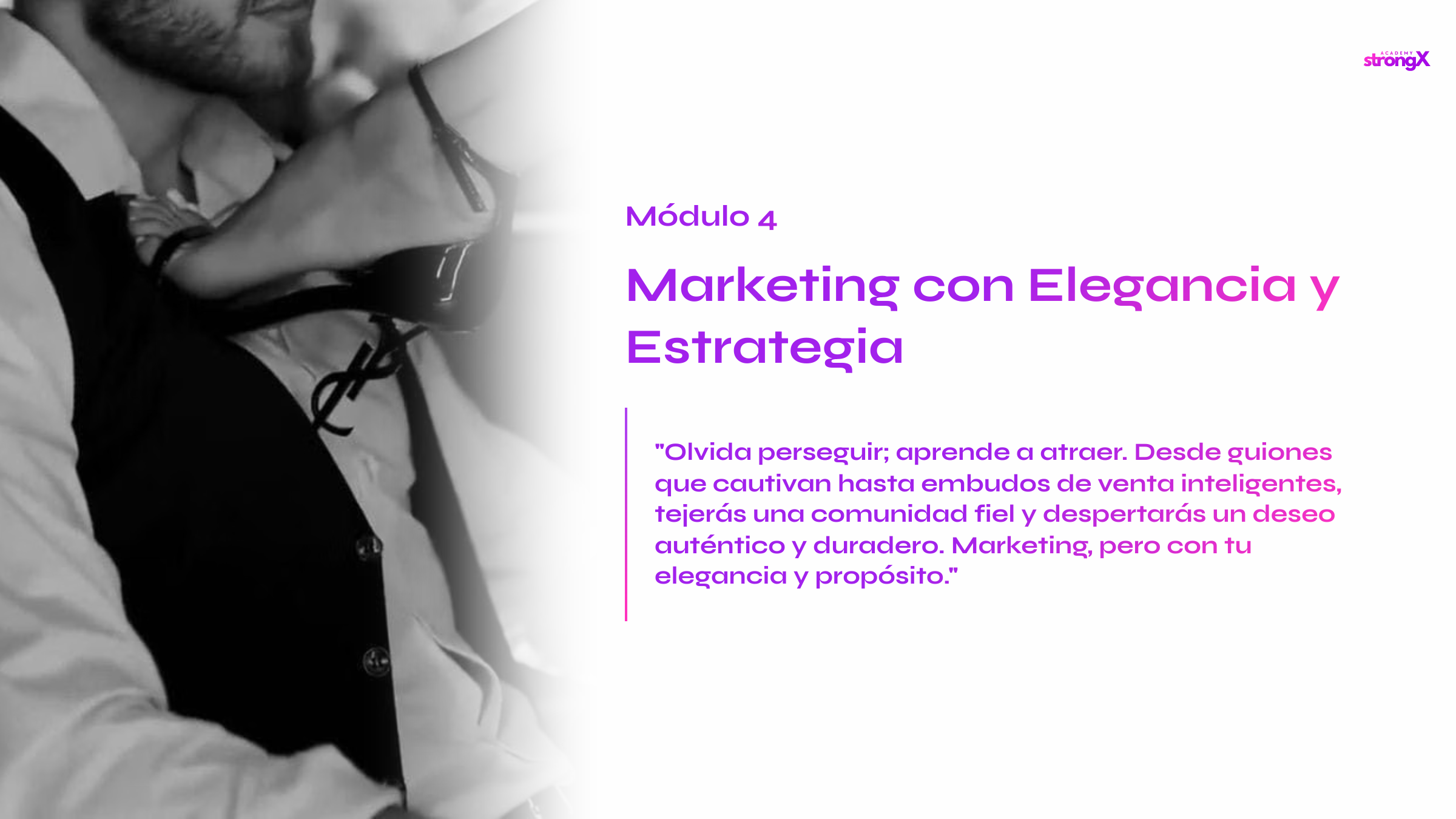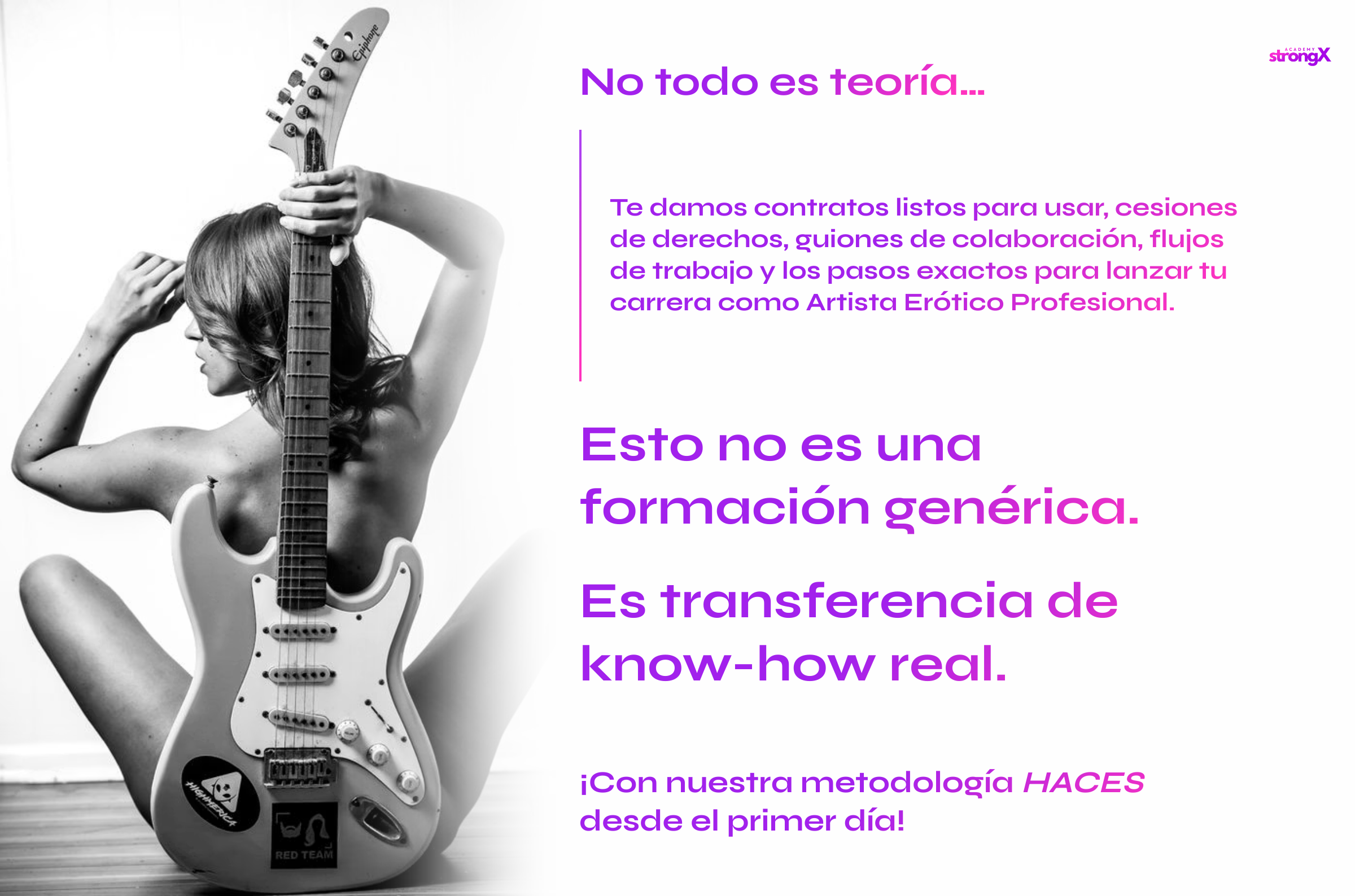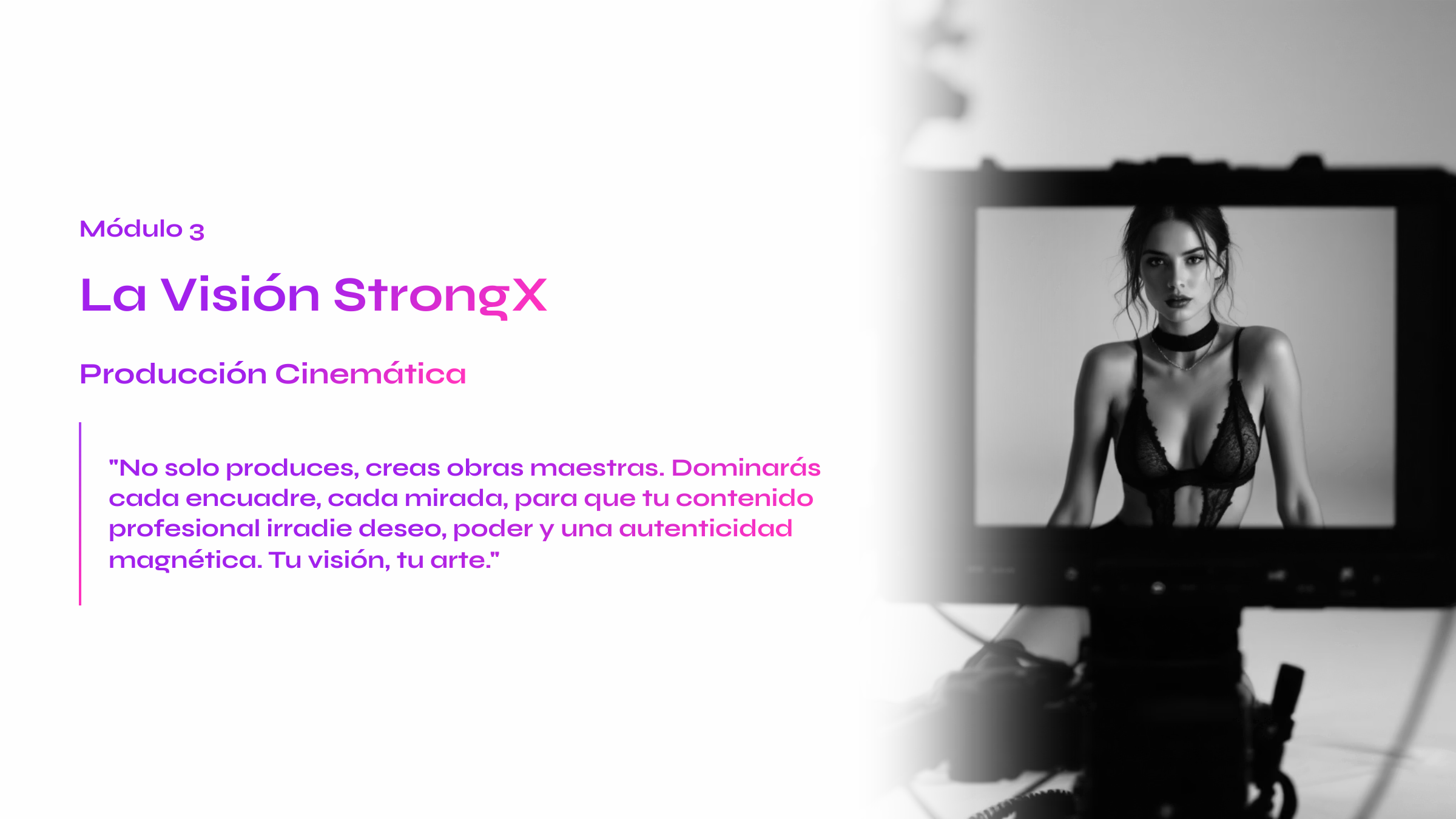 Con este formato, la agencia StrongX te acompaña como mentor: mentalidad sólida, técnica de cine erótico y estrategias de venta elegante para enamorar, seducir y convertir a tu audiencia en una gran comunidad.