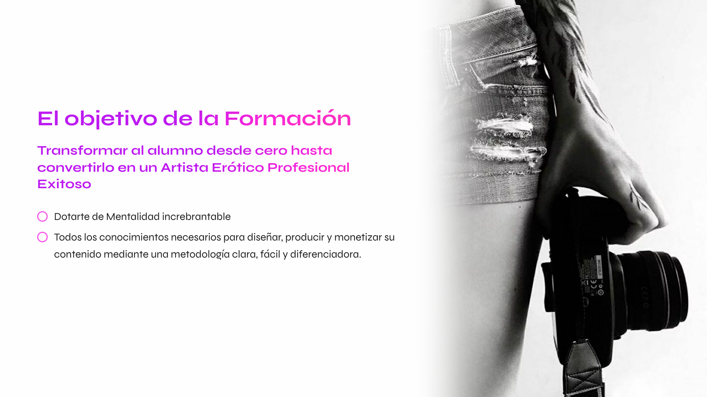 Transformar al alumno desde cero hasta convertirlo en un Artista Erótico Exitoso, dotándolo de la mentalidad y los conocimientos necesarios para diseñar, producir y monetizar su contenido mediante una metodología clara, facil y diferenciadora.